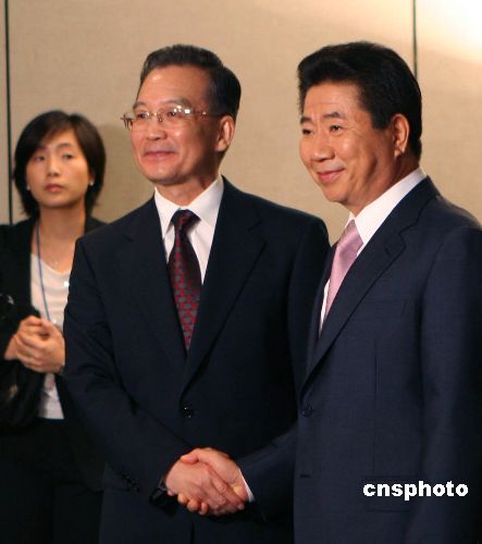 中國(guó)國(guó)務(wù)院總理溫家寶十一月二十日上午在新加坡會(huì)見(jiàn)韓國(guó)總統(tǒng)盧武鉉。溫家寶表示,中韓在半島及東北亞地區(qū)有著廣泛的共同利益。中方愿繼續(xù)保持同韓方的溝通和配合,共同推動(dòng)半島無(wú)核化進(jìn)程不斷取得新進(jìn)展。中方將一如既往地堅(jiān)定支持南北和解合作進(jìn)程,將積極參與半島和平機(jī)制的建立。中新社發(fā) 周群 攝