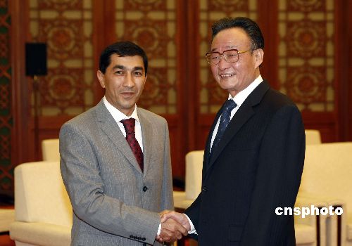 十一月二十三日,全國(guó)人大常委會(huì)委員長(zhǎng)吳邦國(guó)在北京人民大會(huì)堂會(huì)見來(lái)訪的烏茲別克斯坦最高會(huì)議立法院副主席沙特莫諾夫。中新社發(fā) 盛佳鵬 攝
