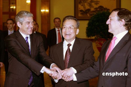 十一月二十八日,北京人民大會(huì)堂,中國(guó)國(guó)務(wù)院總理溫家寶會(huì)見歐盟輪值主席國(guó)葡萄牙總理蘇格拉底(左)與歐盟委員會(huì)主席巴羅佐(右)。他們是前來參加第四屆中歐工商峰會(huì)的。中新社發(fā) 廖文靜 攝