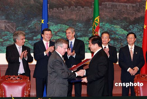 十一月二十八日,北京人民大會堂,中國國務(wù)院總理溫家寶會見歐盟輪值主席國葡萄牙總理索克拉特斯(后左三)與歐盟委員會主席巴羅佐(后左二),并在會見后共同出席中國與歐盟三項(xiàng)合作文本的簽字儀式。中新社發(fā) 廖文靜 攝