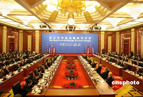 十二月十二日,第三次中美戰(zhàn)略經(jīng)濟(jì)對話在北京中信國安第一城開幕,胡錦濤主席特別代表、國務(wù)院副總理吳儀致辭。中新社發(fā) 毛建軍 攝