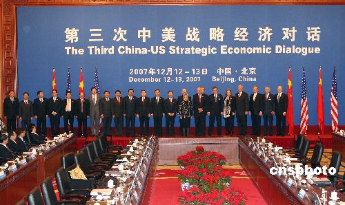 十二月十二日,第三次中美戰(zhàn)略經(jīng)濟對話在北京中信國安第一城開幕。會議開始前,中國國務(wù)院副總理吳儀(前右八)、美國財長鮑爾森(前右七)與中美參會部長高官們合影。中新社發(fā) 毛建軍 攝
