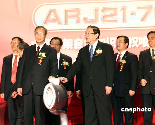 十二月二十一日,由中國航空工業(yè)第一集團(tuán)公司(中國一航)自行研制生產(chǎn)的中國首架自主知識產(chǎn)權(quán)噴氣支線客機(jī)ARJ21-700飛機(jī),在上海飛機(jī)制造廠順利實現(xiàn)總裝下線。中國國務(wù)院副總理曾培炎(前排左)和中共中央政治局委員、上海市市委書記俞正聲(前排右)出席隆重的總裝下線儀式。中新社發(fā) 文音 攝