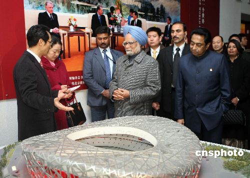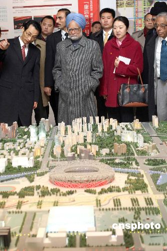 圖:印度總理辛格參觀北京奧運(yùn)會(huì)場(chǎng)館建設(shè)