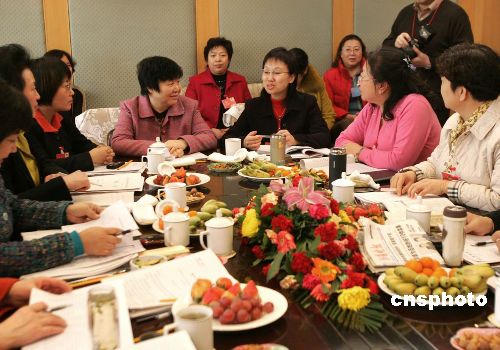 圖為婦聯(lián)政協(xié)委員們在一起審議政府工作報告。