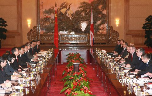 一月十八日,中國國務(wù)院總理溫家寶在北京人民大會堂與英國首相布朗舉行會談。中新社發(fā) 廖文靜 攝