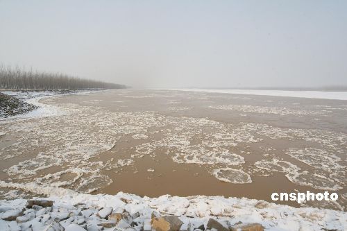 2008年1月20日,黃河下游山東河段,梁山縣高堂以下河段流凌,流凌長(zhǎng)度約470公里,流凌密度10—30%,最大70%(河口一號(hào)壩)。冰塊面積一般3~10m2,最大面積100 m2(河口一號(hào)壩)。局部河段有岸冰。中新社發(fā) 俄國(guó)慶 攝