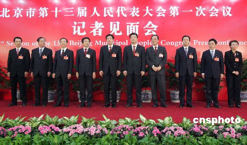 1月26日,北京市第十三屆人大一次會議閉幕,新當(dāng)選的北京市市長郭金龍率全體副市長集體亮相。從左至右分別為:陳剛、趙鳳桐、牛有成、蔡赴朝、郭金龍、吉林、劉敬民、陸昊、丁向陽、程紅。中新社發(fā) 張宇 攝