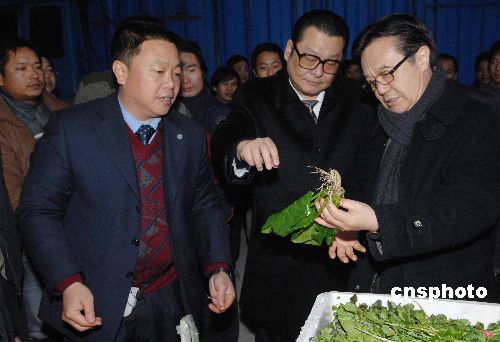 二月二日下午,中國商務(wù)部副部長高虎城(右一)一行冒雨抵達深圳,考察深圳南山農(nóng)產(chǎn)品批發(fā)市場供港果菜基地,要求深圳政府及供應(yīng)商克服困難、保障香港市場的需求。深圳市政府副市長陳應(yīng)春表示,深圳人寧愿少吃,也要保障香港同胞不斷檔。中新社發(fā) 陳文 攝