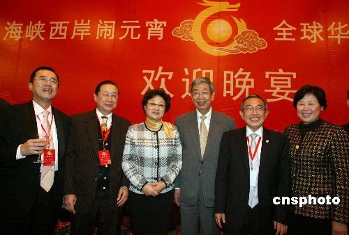 2月18日晚,中國(guó)國(guó)務(wù)院僑務(wù)辦公室、福建省人民政府和海峽兩岸關(guān)系協(xié)會(huì)在福州市舉辦晚宴,熱烈歡迎來(lái)閩參加“海峽西岸鬧元宵 全球華人盼團(tuán)圓”活動(dòng)的海外華僑華人、港澳同胞和臺(tái)灣同胞代表。全國(guó)人大常委會(huì)副委員長(zhǎng)許嘉璐,國(guó)務(wù)院僑務(wù)辦公室主任李海峰,福建省人大常委會(huì)副主任王美香,福建省人民政府副省長(zhǎng)洪捷序,福建省政協(xié)副主席張帆等出席了歡迎晚宴。圖為全國(guó)人大常委會(huì)副委員長(zhǎng)許嘉璐、國(guó)務(wù)院僑務(wù)辦公室主任李海峰與嘉賓合影祝酒。中新社發(fā) 張勤 攝