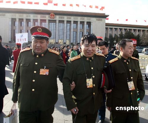 3月2日,全國(guó)政協(xié)十一屆一次會(huì)議預(yù)備會(huì)在北京人民大會(huì)堂舉行,毛澤東之孫、全國(guó)政協(xié)新委員毛新宇(左一)參加會(huì)議后,與其他委員相扶走出大會(huì)堂。中新社發(fā) 盛佳鵬 攝