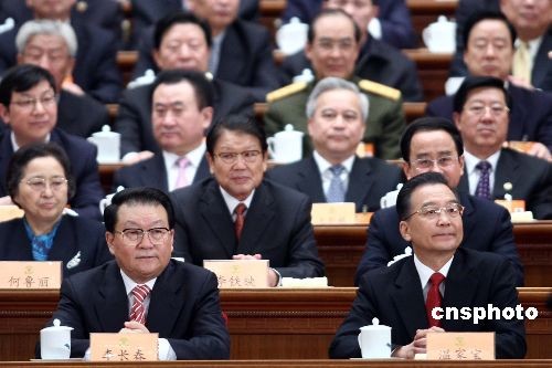 3月3日下午,全國(guó)政協(xié)十一屆一次會(huì)議在北京人民大會(huì)堂開(kāi)幕,中共中央政治局常委、國(guó)務(wù)院總理溫家寶,中共中央政治局常委李長(zhǎng)春出席。中新社發(fā) 盛佳鵬 攝