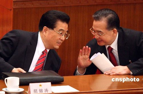 3月5日上午,十一屆全國人大一次會議在北京開幕。溫家寶作政府工作報告后,與胡錦濤進行交談。中新社發(fā) 張宇 攝