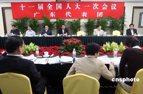 3月12日,參加十一屆全國人大一次會議的廣東代表團舉行小組會議,審議國務(wù)院機構(gòu)改革方案。中新社發(fā) 張宇 攝