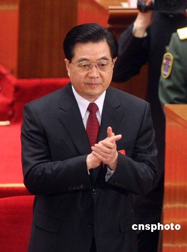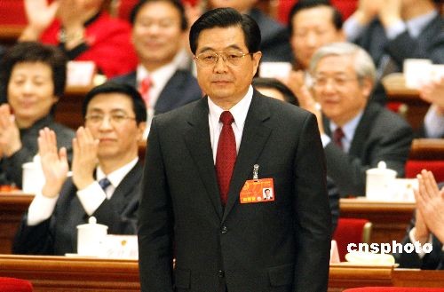 3月15日上午,十一屆全國人大一次會議第五次全體會議在北京人民大會堂舉行,胡錦濤再次當(dāng)選中華人民共和國主席、中華人民共和國中央軍事委員會主席。中新社發(fā) 張宇 攝