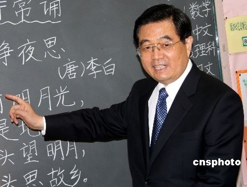 5月9日下午,正在日本訪問的中國國家主席胡錦濤前往橫濱中華山手學校參觀,并觀摩了該校小學三年級同學的語文課。在課上,胡錦濤主席饒有興致地走上講臺,給同學們講解唐詩《靜夜思》。中新社發(fā) 齊彬 攝