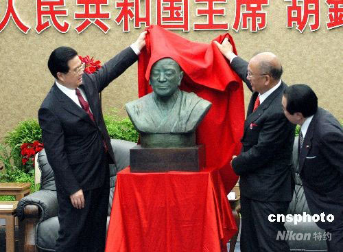 圖:胡錦濤為鑒真銅像揭幕