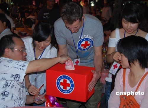 連日來,桂林全城涌動(dòng)捐款熱潮,截至五月十九日下午六時(shí),桂林市民眾為四川地震災(zāi)區(qū)募集善款一千六百六十二點(diǎn)九六萬元人民幣。圖為外國游客在陽朔西街協(xié)助桂林紅十字會(huì)工作人員募捐。