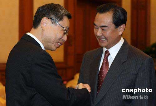 6月12日晚,新任中臺(tái)辦、國臺(tái)辦主任王毅(右)在北京釣魚臺(tái)會(huì)見并宴請(qǐng)臺(tái)灣海峽交流基金會(huì)董事長江丙坤一行。會(huì)見時(shí),王毅與;鶗(huì)副董事長高孔廉親切交談。中新社發(fā) 任晨鳴 攝