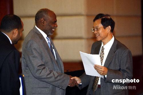 6月26日,以“和平、發(fā)展”為主題的蘇丹達(dá)爾富爾問題國際研討會(huì)在北京舉行,中國政府達(dá)爾富爾問題特別代表劉貴今(右)和參會(huì)代表在會(huì)前交談。中新社發(fā) 杜洋 攝