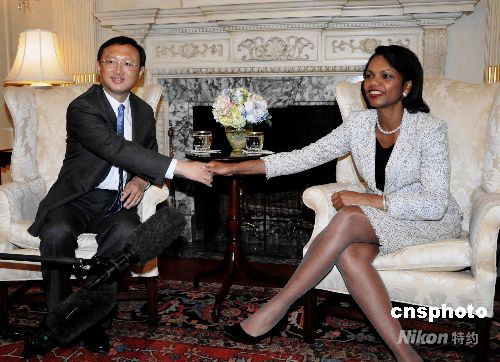7月28日,正在美國(guó)華盛頓訪問的中國(guó)外交部長(zhǎng)楊潔篪與美國(guó)國(guó)務(wù)卿賴斯舉行會(huì)談。中新社發(fā) 邱江波 攝