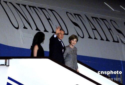 8月7日晚,美國總統(tǒng)布什抵達北京,將出席北京奧運會開幕式。 中新社發(fā) 王東明 攝