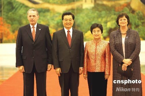 8月8日中午,中國國家主席胡錦濤和夫人劉永清在北京人民大會堂為出席北京奧運(yùn)會的貴賓舉行歡迎宴會。圖為胡錦濤夫婦歡迎國際奧委會主席羅格。中新社發(fā) 任海霞 攝