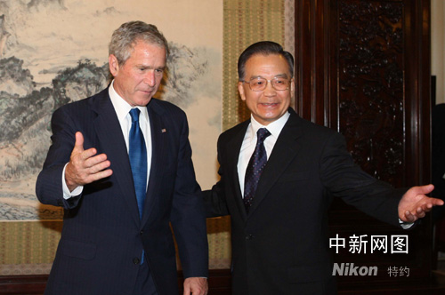 8月10日,中國國務院總理溫家寶在北京中南海會見美國總統(tǒng)布什一行。中新社記者 廖文靜攝
