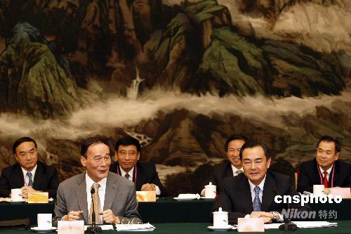 8月28日,2008年臺(tái)商座談會(huì)在北京人民大會(huì)堂舉行。國(guó)務(wù)院副總理王岐山和國(guó)務(wù)院20多個(gè)主要部門(mén)負(fù)責(zé)人及60多位臺(tái)灣工商界人士、大陸臺(tái)商代表參加座談。中共中央臺(tái)辦、國(guó)務(wù)院臺(tái)辦主任王毅主持會(huì)談。中新社發(fā) 盛佳鵬 攝