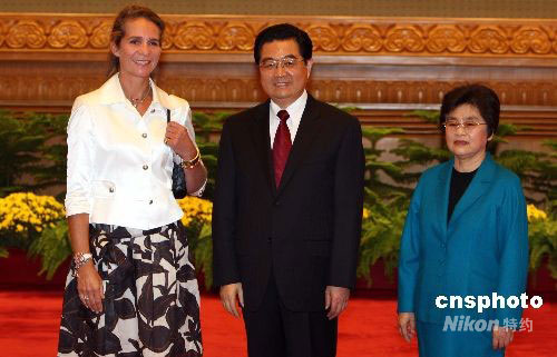 九月六日,國(guó)家主席胡錦濤夫婦在北京人民大會(huì)堂歡迎出席2008年殘奧會(huì)的各國(guó)貴賓。圖為胡錦濤夫婦歡迎西班牙公主愛(ài)萊娜。中新社發(fā) 任海霞 攝