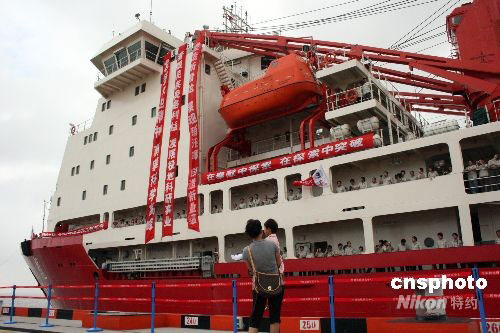 九月二十四日,搭乘著中國第三次北極科考隊(duì)的“雪龍”號(hào)極地破冰船凱旋“回家”,停泊在上海浦東外高橋碼頭。此次出征歷時(shí)兩個(gè)多月,航程超過萬余海里。中新社發(fā) 陸從兵 攝