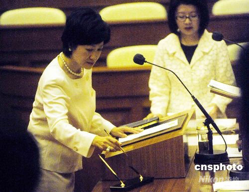十月八日,香港新一屆立法會(huì)舉行首次會(huì)議,議員逐一宣誓就職。圖為葉劉淑儀宣誓。中新社發(fā) 譚達(dá)明 攝