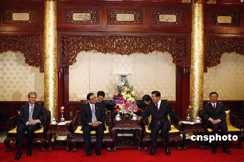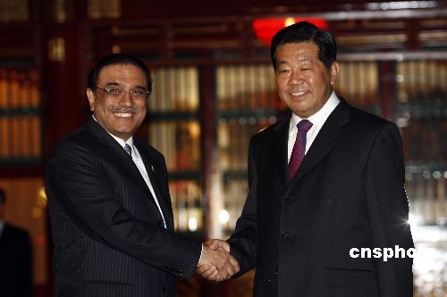 10月16日,中國全國政協(xié)主席賈慶林在北京釣魚臺國賓館會見巴基斯坦總統(tǒng)扎爾達(dá)里。中新社發(fā) 盛佳鵬 攝