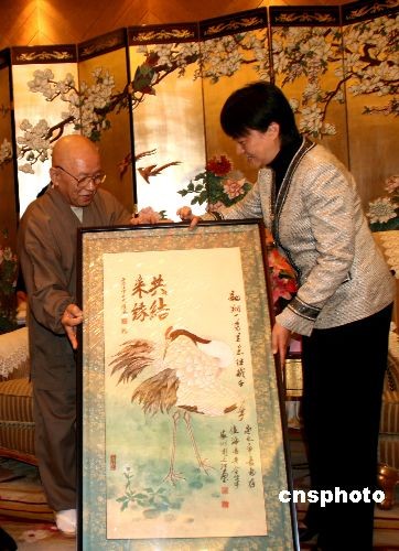 揚州女市長王燕文和松浦俊海長老互贈禮品“共結(jié)來緣”。