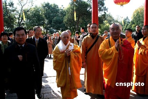 11月11日,日本奈良市長藤原昭、唐招提寺長老松浦俊海率友好代表團(tuán)一行,在揚(yáng)州市領(lǐng)導(dǎo)陪同下拜訪揚(yáng)州大明寺并舉行鑒真大和尚追思會(huì)。大明寺能修大師率兩序大眾在山門親自迎接,并舉行了隆重的歡迎儀式。中新社發(fā) 崔佳明 攝