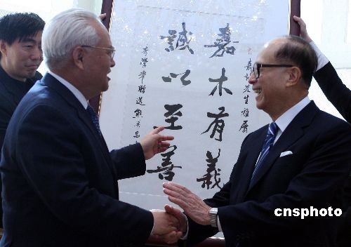 民政部長李學(xué)舉(左)向李嘉誠贈(zèng)送禮品。