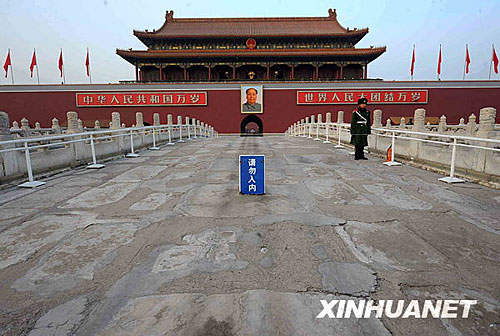 據(jù)北京市文物局9日透露,為迎接2009年國(guó)慶60周年,確保游客和文物安全,北京市文物局已于近日啟動(dòng)了天安門(mén)金水橋加固修繕工程,整個(gè)工程預(yù)計(jì)將于2009年5月完工。天安門(mén)金水橋是整個(gè)天安門(mén)景觀(guān)的重要組成部分,因游客眾多以及風(fēng)化等自然因素,天安門(mén)金水橋橋面此前多處出現(xiàn)破損,欄桿部分也出現(xiàn)裂縫,存在一定的安全隱患。新華社記者羅曉光攝