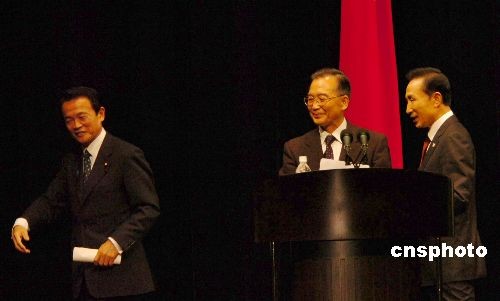 12月13日下午,首次獨(dú)立于其它國(guó)際會(huì)議而單獨(dú)舉行的中日韓三國(guó)領(lǐng)導(dǎo)人會(huì)議在日本福岡舉行。圖為中國(guó)總理溫家寶(中)、日本首相麻生太郎(左)和韓國(guó)總統(tǒng)李明博出席會(huì)議。中新社發(fā) 朱沿華 攝