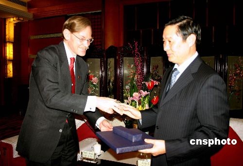 12月14日,世界銀行行長佐利克一行在成都會見了四川省委書記劉奇葆,兩人就全球經(jīng)濟危機影響下雙方在四川災(zāi)后重建和成都統(tǒng)籌試驗區(qū)建設(shè)等方面的合作意愿交流了看法。圖為佐利克(左)與劉奇葆(右)互贈禮物。中新社發(fā) 黃永莉 攝