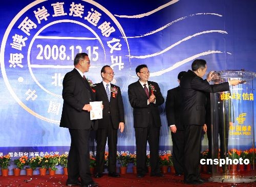 12月15日,由國家郵政局、國務院臺灣事務辦公室、北京市政府主辦、中國郵政集團承辦的海峽兩岸直接通郵儀式,與會佳賓向臺灣投遞第一批信件,標志著海峽兩岸將實現(xiàn)全面、直接、雙向通郵,直接開辦各項郵政業(yè)務。大陸方面郵件封局為北京、上海、廣州、福州、廈門、西安、南京、成都,臺灣方面郵件封局為臺北、高雄、基隆、金門、馬祖。中新社發(fā) 宋吉河 攝