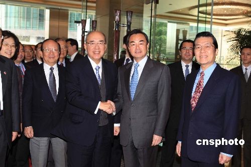 12月19日中午,中國國民黨主席吳伯雄一行乘直航包機(jī)抵達(dá)上海,準(zhǔn)備出席將于二十日至二十一日在上海舉行的第四屆兩岸經(jīng)貿(mào)文化論壇。中共中央臺(tái)辦主任王毅在香格里拉酒店迎候吳伯雄一行。中新社發(fā) 潘索菲 攝