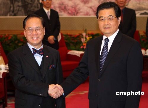 12月19日下午,國家主席胡錦濤在北京中南海會見前來述職的香港特別行政區(qū)行政長官曾蔭權(quán)。中新社發(fā) 任晨鳴 攝