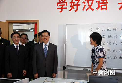 正在毛里求斯訪(fǎng)問(wèn)的中國(guó)國(guó)家主席胡錦濤,當(dāng)?shù)貢r(shí)間十七日下午來(lái)到毛里求斯中國(guó)文化中心參觀(guān)。圖為他在漢語(yǔ)語(yǔ)音教室內(nèi)聆聽(tīng)當(dāng)?shù)貙W(xué)員用中文朗誦宋代詩(shī)人蘇軾的名篇《飲湖上初晴后雨》。中新社記者 齊彬攝