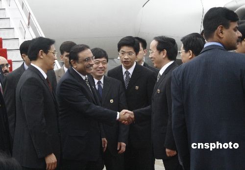 2月22日中午,在湖北進(jìn)行友好訪問(wèn)的巴基斯坦總統(tǒng)扎爾達(dá)里乘機(jī)抵達(dá)湖北宜昌市。在宜昌市期間,扎爾達(dá)里將與中國(guó)三峽總公司舉行項(xiàng)目會(huì)談,并參觀三峽工程紀(jì)念館和三峽大壩等。圖文扎爾達(dá)里總統(tǒng)與宜昌市長(zhǎng)李樂(lè)成握手。中新社發(fā) 艾啟平 攝