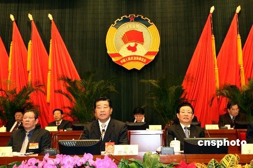 2月27日,政協(xié)第十一屆全國委員會常務(wù)委員會第四次會議在北京閉幕。中共中央政治局常委、全國政協(xié)主席賈慶林(中)出席會議并作講話。中新社發(fā) 杜洋 攝