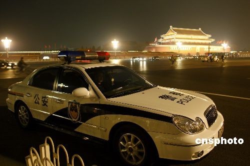 3月3日晚,北京警方在天安門廣場周邊加強夜間巡邏,確保“兩會”安全。中新社發(fā) 鄭雄增 攝