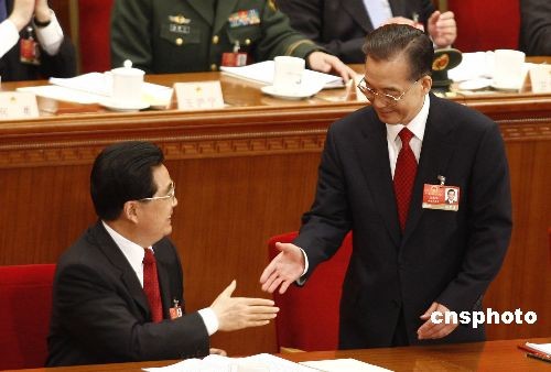 3月5日上午,十一屆全國人大二次會議在北京人民大會堂開幕,中國國家主席胡錦濤與國務(wù)院總理溫家寶互致問候。中新社發(fā) 盛佳鵬 攝