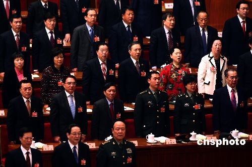 3月5日,第十一屆全國(guó)人民代表大會(huì)第二次會(huì)議在北京人民大會(huì)堂開幕。參會(huì)代表全體起立,高唱國(guó)歌。中新社發(fā) 杜洋 攝