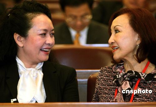 3月7日下午,全國政協(xié)十一屆二次會議舉行第二次全體大會,出席會議的彭麗媛與鄭明明輕松交談。中新社發(fā) 宋吉河 攝
