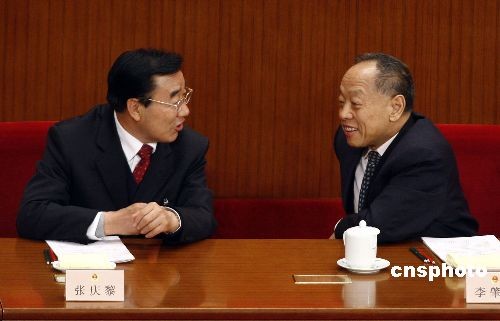 3月9日,十一屆全國人大二次會(huì)議在北京人民大會(huì)堂舉行第二次全體會(huì)議,西藏自治區(qū)黨委書記張慶黎與李肇星在開會(huì)前交談。 中新社發(fā) 盛佳鵬 攝